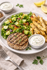 Grass-fed ground beef, Greek yogurt, Worcestershire sauce, Dijon mustard, onion powder, garlic, salt, pepper, potatoes, olive oil, mixed greens, dill